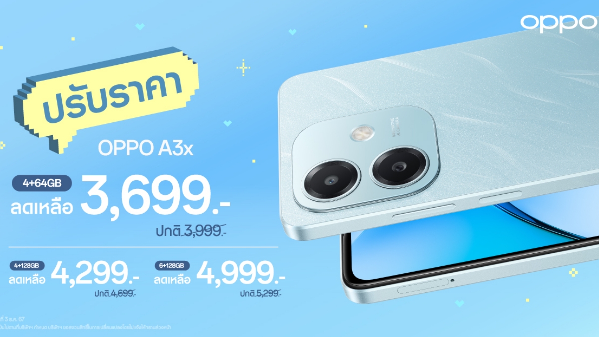 OPPO ประกาศปรับราคาสมาร์ตโฟน OPPO A3x ให้คุ้มค่ายิ่งขึ้น พร้อมวางจำหน่ายในราคาใหม่เริ่มต้นเพียง 3,699 บาท มาพร้อมสเปกจัดเต็มทั้งหน้าจอสว่าง แบตเตอรี่อึด และความทนทานระดับมาตรฐานทหาร เริ่ม 3 ธันวาคม 2567 นี้