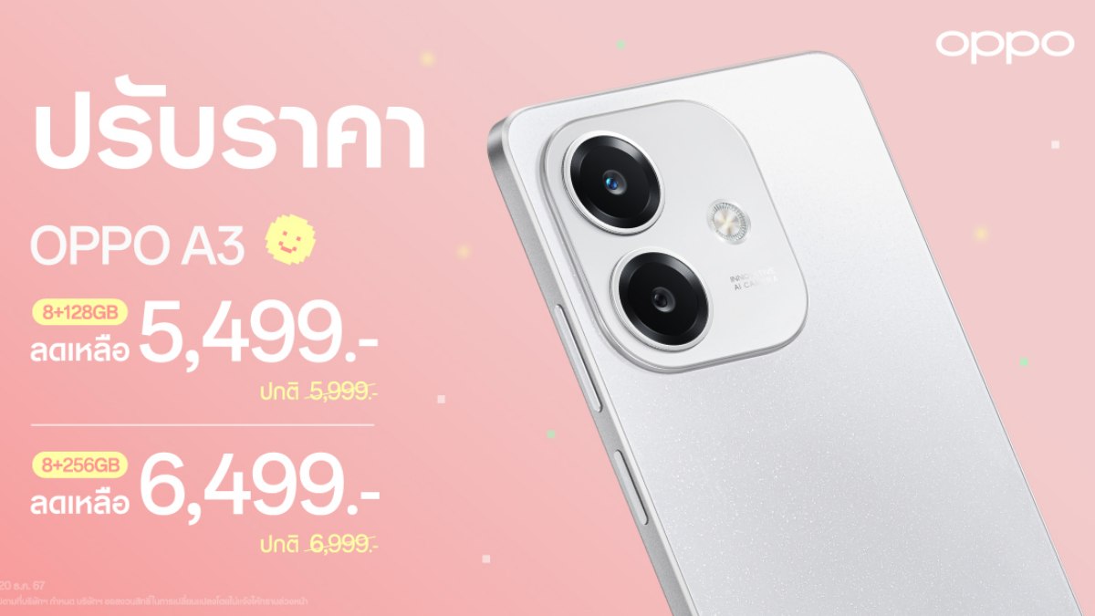 OPPO เดินหน้าตลาดสมาร์ตโฟนระดับกลาง เปิดตัว OPPO A3 รุ่นล่าสุดจากตระกูล A Series ที่มาพร้อมจอแสดงผลความสว่าง 1,000 nits รีเฟรชเรต 90Hz และแบตเตอรี่ขนาดใหญ่ 5,100mAh ชาร์จไว 45W พร้อมรับรองมาตรฐานกันกระแทกระดับทหาร ตอบโจทย์ผู้ใช้งานที่ต้องการสมาร์ตโฟนทนทานในราคาคุ้มค่า