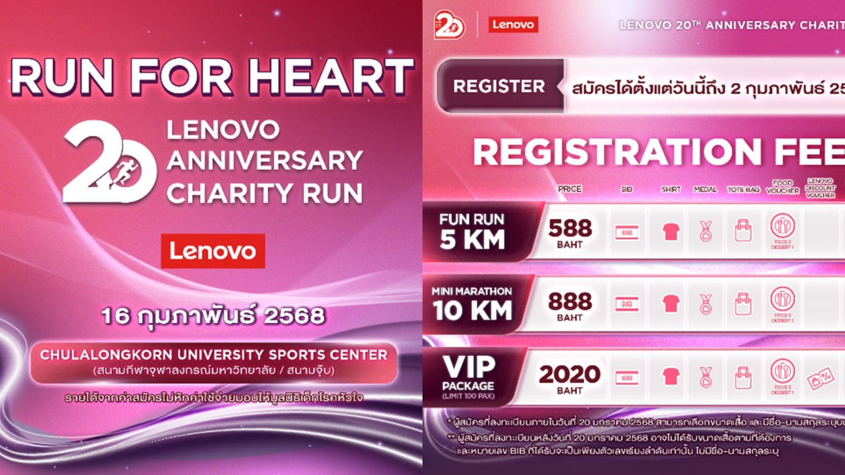 บริษัทผู้นำด้านเทคโนโลยีระดับโลกอย่าง เลอโนโว ประกาศความพร้อมจัดงาน Lenovo 20th Anniversary Charity Run 2025 – Run for Heart ในวันที่ 16 กุมภาพันธ์ 2568 ณ สนามกีฬาจุฬาลงกรณ์มหาวิทยาลัย โดยรายได้ทั้งหมดจะนำไปสนับสนุนมูลนิธิเด็กโรคหัวใจในพระอุปถัมภ์ของสมเด็จพระเจ้าพี่นางเธอ เจ้าฟ้ากัลยาณิวัฒนา กรมหลวงนราธิวาสราชนครินทร์ เพื่อสนับสนุนการรักษาและดูแลเด็กที่มีภาวะโรคหัวใจทั่วประเทศ