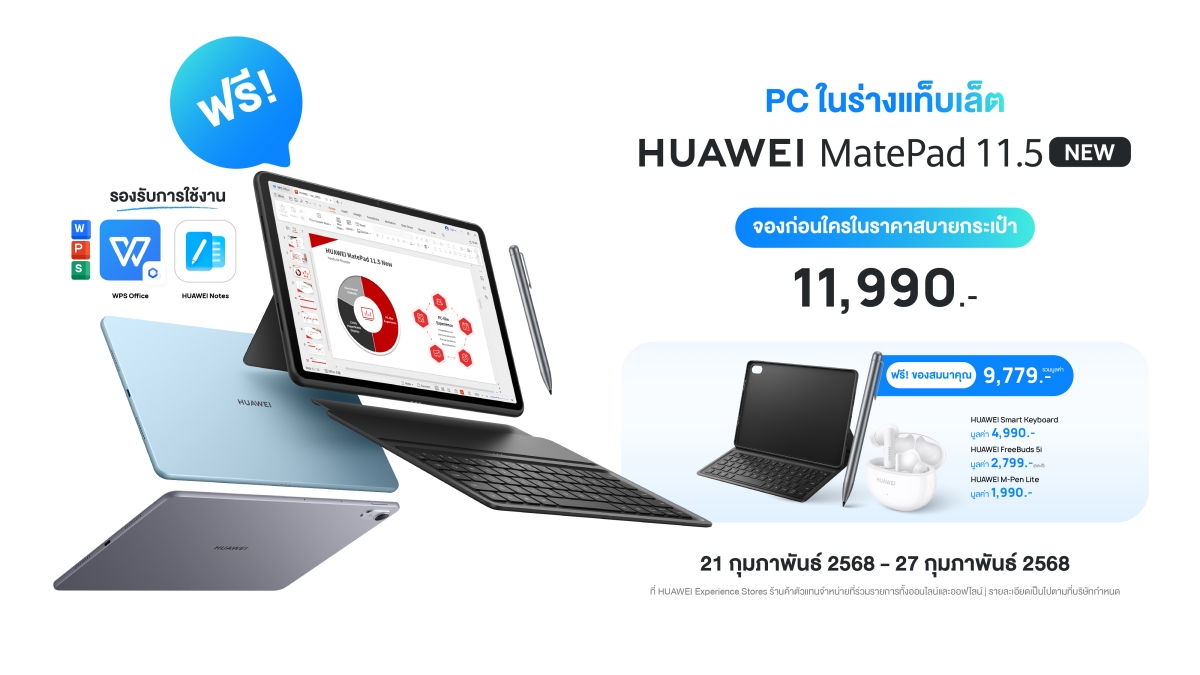 หัวเว่ย เปิดตัว HUAWEI MatePad 11.5 NEW แท็บเล็ตรุ่นใหม่ล่าสุดที่มาพร้อมฟังก์ชันการทำงานครบครันในราคาเริ่มต้นเพียง 11,990 บาท พร้อมโปรโมชันพิเศษสำหรับการพรีออเดอร์มูลค่ารวมกว่า 9,000 บาท