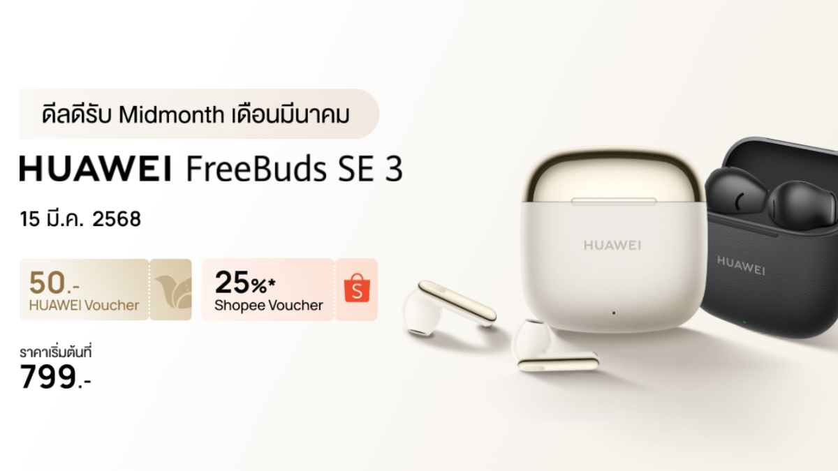 หูฟังคุณภาพระดับพรีเมียมในราคาสบายกระเป๋า HUAWEI FreeBuds SE 3 พร้อมให้คุณเป็นเจ้าของในราคาเริ่มต้นเพียง 799 บาท พร้อมรับส่วนลดพิเศษสูงสุด 25% เฉพาะที่ Shopee วันที่ 15 มีนาคมนี้เท่านั้น