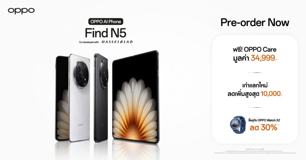 ออปโป้ ไทยแลนด์ ผู้นำตลาดสมาร์ตโฟนในประเทศไทย เดินหน้ายกระดับนวัตกรรมสมาร์ตโฟนจอพับ เปิดตัว “OPPO Find N5” รุ่นใหม่ล่าสุด ภายใต้แนวคิด ‘บาง เบา ทรงพลังทุกมิติ’ โดดเด่นด้วยดีไซน์บางเพียง 8.93 มิลลิเมตร พร้อมรอยพับจอที่แทบมองไม่เห็น ผสานประสิทธิภาพการทำงานระดับ PC รองรับการทำงานแบบมัลติทาสก์ มาพร้อมผู้ช่วย AI อัจฉริยะและการเชื่อมต่อระบบ Mac จากระยะไกลที่ลื่นไหล เสริมทัพด้วย OPPO Watch X2 สมาร์ตวอตช์ระดับแฟลกชิปดีไซน์หรูหรา พร้อมฟีเจอร์ตรวจสุขภาพภายใน 1 นาที