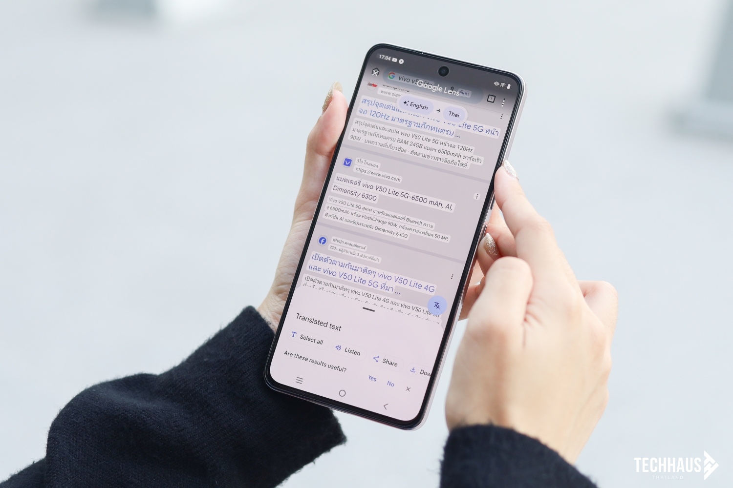 vivo V50 Lite มาพร้อมฟีเจอร์ AI ที่ช่วยให้การใช้งานเป็นเรื่องง่ายและสะดวกยิ่งขึ้น เริ่มจาก Circle to Search ฟีเจอร์ค้นหาข้อมูลโดยการแตะหรือวงกลมที่ข้อความหรือภาพบนหน้าจอ ระบบจะทำการค้นหาข้อมูลจาก Google ให้ทันที และยังรองรับฟีเจอร์ค้นหาเพลงที่สามารถระบุและค้นหาเพลงที่กำลังเล่นบนสมาร์ทโฟนหรืออุปกรณ์อื่นๆ ได้อย่างรวดเร็ว ไม่ต้องเสียเวลาพิมพ์หรือค้นหาอีกต่อไป