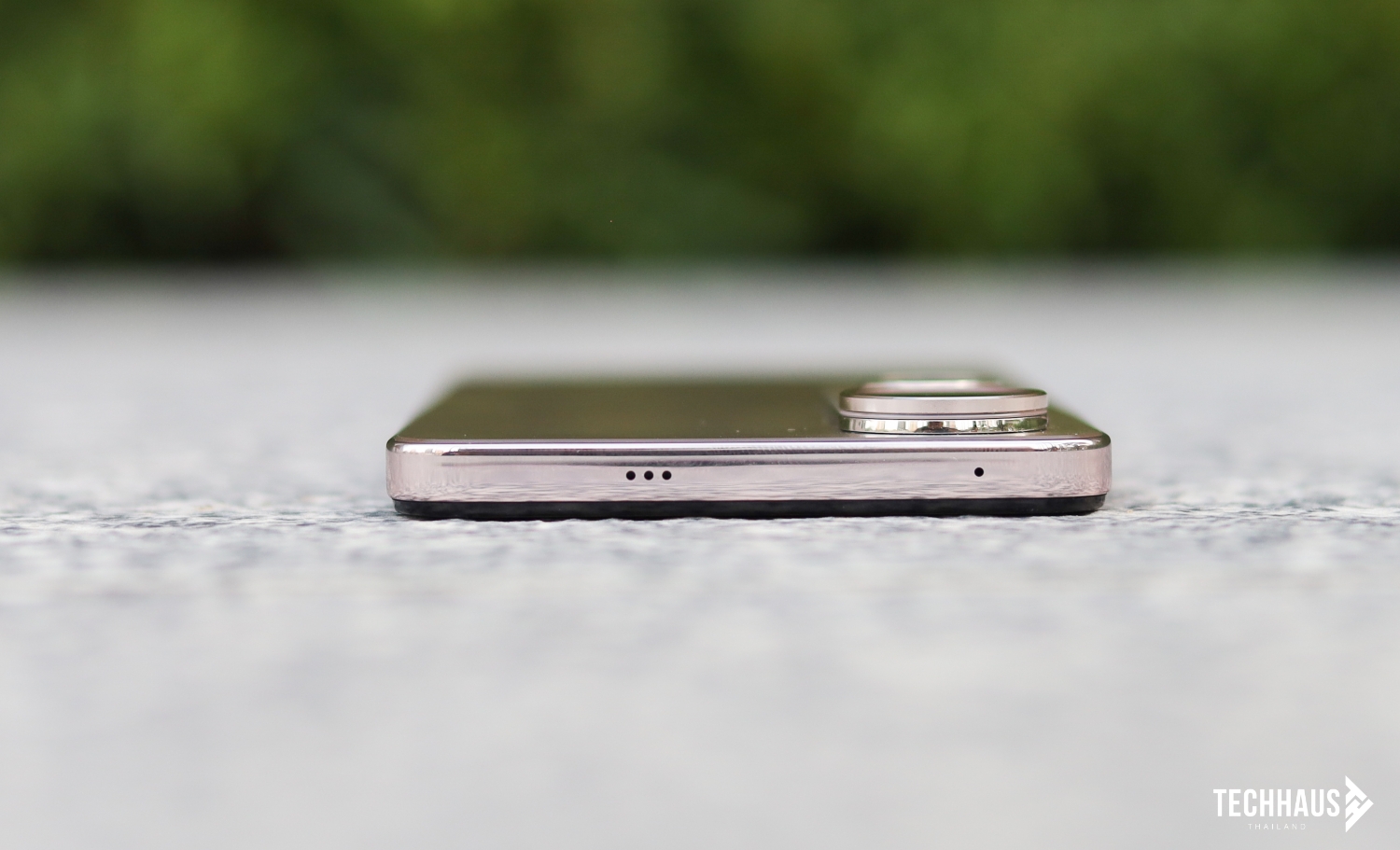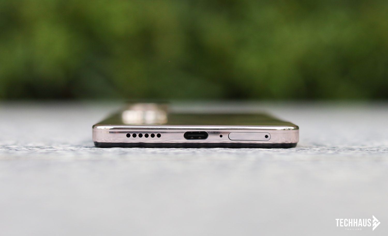 ส่วนด้านล่างของตัวเครื่องมีการจัดวางอย่างเป็นระเบียบ ทางซ้ายสุดคือช่องใส่ถาดซิมการ์ดที่ดึงออกได้ง่าย ตรงกลางเป็นพอร์ต USB Type-C สำหรับชาร์จแบตเตอรี่แบบเร็ว 90W และขวาสุดเป็นลำโพงเสียงที่ทำงานร่วมกับลำโพงด้านบนให้เสียงสเตอริโอที่ทรงพลัง