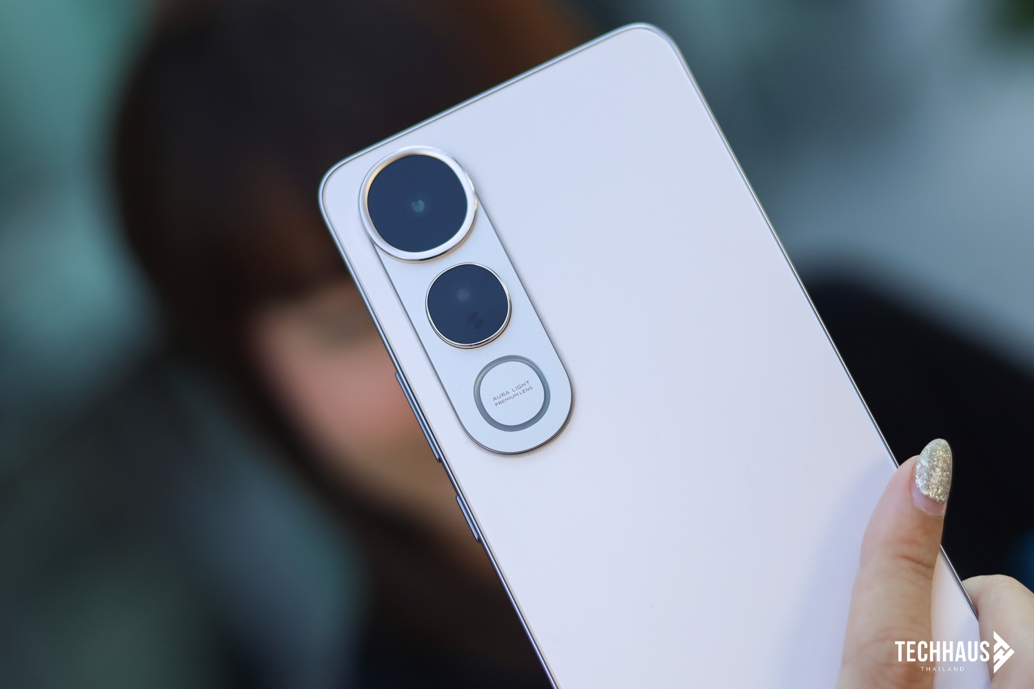 เมื่อพลิกกลับมาดูฝาหลังของ vivo V50 Lite สิ่งที่สะดุดตาทันทีคือโมดูลกล้องที่ออกแบบมาอย่างโดดเด่นด้วยทรงกลมสามวงเรียงกันในแนวตั้ง ล้อมรอบด้วยขอบสีเงินที่ดูหรูหรา ในโมดูลประกอบด้วยกล้องหลัก 2 ตัวคุณภาพสูง และไฟแฟลชแบบ Aura Light ที่ให้แสงนุ่มนวลกว่าไฟแฟลชทั่วไป