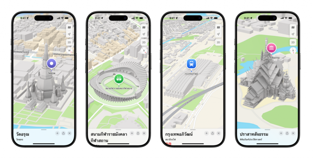 Apple ยังได้นำเสนอแผนที่สามมิติที่มีรายละเอียดสมบูรณ์ยิ่งขึ้นสำหรับสถานที่สำคัญต่างๆ ในประเทศไทย ทำให้ผู้ใช้สามารถสำรวจสถานที่ท่องเที่ยวและจุดสนใจต่างๆ ได้อย่างสมจริงก่อนออกเดินทางจริง