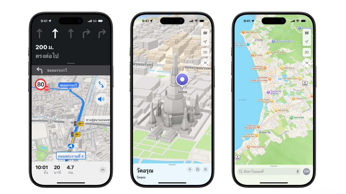 วันนี้ Apple ได้เปิดตัวประสบการณ์การใช้งาน Apple Maps รูปแบบใหม่สำหรับผู้ใช้ในประเทศไทย โดยมาพร้อมกับเทคโนโลยีการนำทางที่ล้ำสมัยและการแสดงผลแผนที่แบบ 3 มิติที่มีรายละเอียดสมบูรณ์มากยิ่งขึ้น การอัปเดตครั้งสำคัญนี้จะช่วยให้ผู้ใช้งานสามารถเดินทางและสำรวจสถานที่ต่างๆ ทั่วประเทศไทยได้อย่างสะดวกและมีประสิทธิภาพมากขึ้น