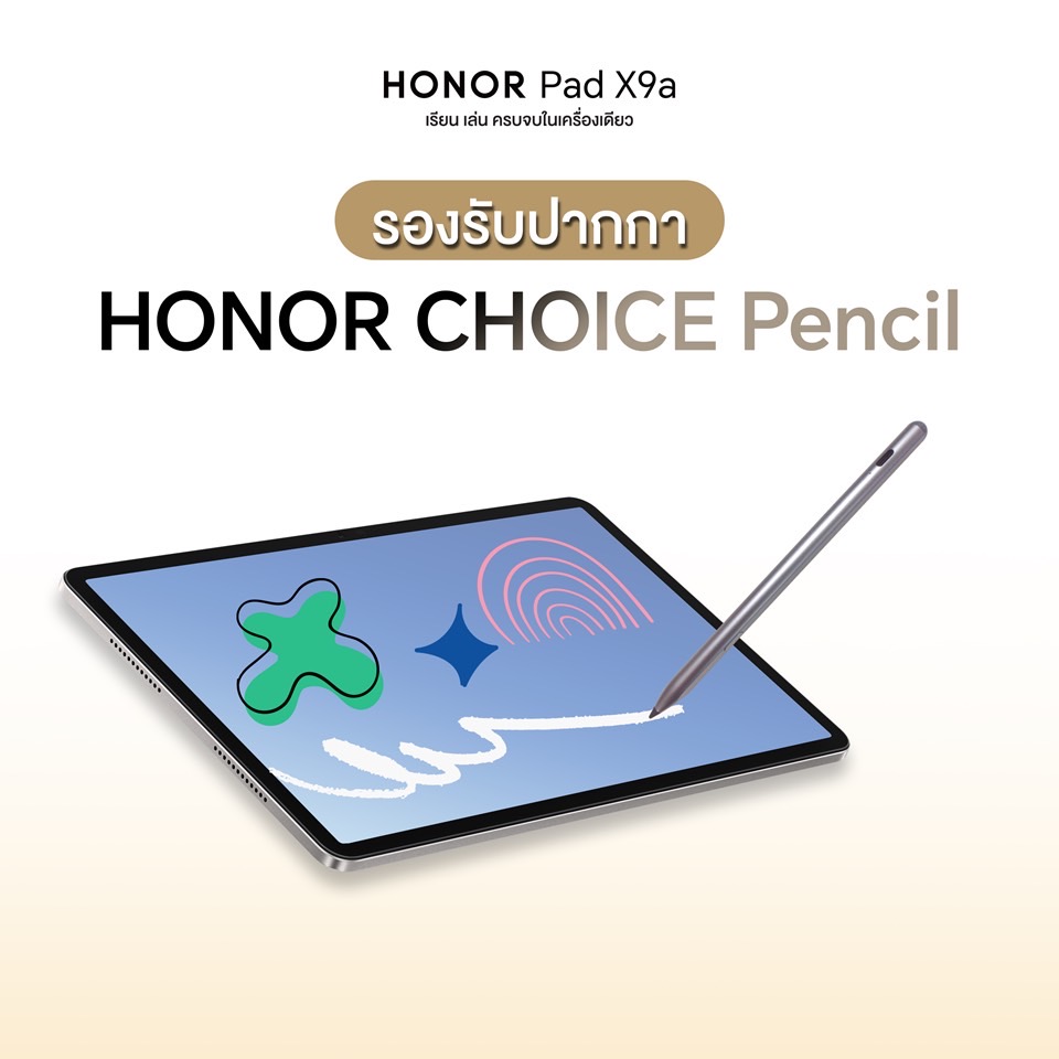 ไฮไลต์สำคัญของ HONOR Pad X9a คือการรองรับปากกา HONOR Choice Pencil อย่างสมบูรณ์แบบ ด้วยการตรวจจับแรงกด 4,096 ระดับ พร้อมการตอบสนองที่รวดเร็วและหน่วงต่ำ เหมาะสำหรับการจดบันทึก วาดภาพ หรือสร้างสรรค์ผลงาน ปากกามีฟังก์ชันปุ่มลบในตัว และฟีเจอร์ Palm Rejection (ป้องกันการสัมผัสฝ่ามือ) ช่วยให้วางมือบนหน้าจอขณะเขียนได้สบาย
