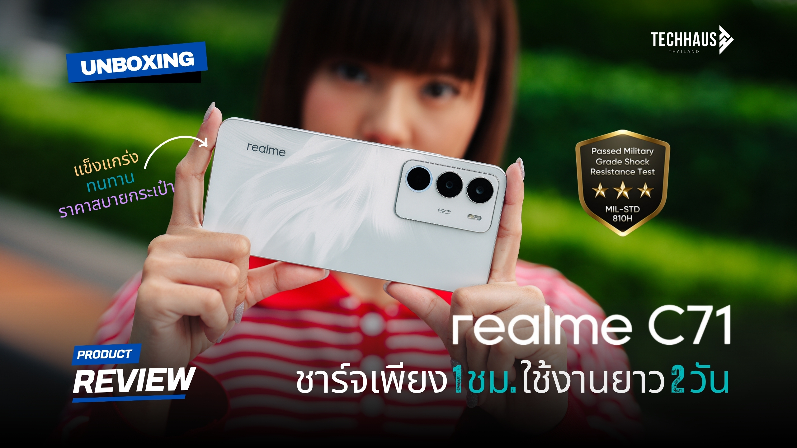 คุณสมบัติพิเศษที่น่าสนใจของ realme C71 คือการได้รับการรับรองมาตรฐาน MIL-STD-810H ซึ่งเป็นมาตรฐานการทดสอบความทนทานระดับทหารที่เข้มงวด