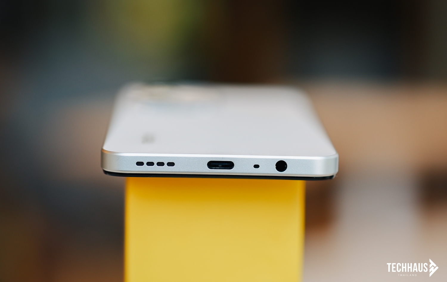 ด้านล่างของตัวเครื่องจะประกอบไปด้วยช่องหูฟัง 3.5 มม., ถัดมาเป็นไมโครโฟนตัดเสียงรบกวน, พอร์ต USB Type-C อยู่ตรงกลาง และทางขวาเป็นลำโพงเสียง