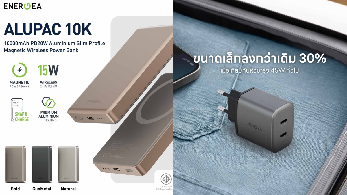 บริษัท อาร์ทีบี เทคโนโลยี จำกัด ผู้นำเข้าและจัดจำหน่ายสินค้าแกดเจ็ตรายใหญ่ของประเทศไทย ประกาศเปิดตัวผลิตภัณฑ์ใหม่ล่าสุดจากแบรนด์ Energea สามรุ่นพร้อมกัน ประกอบด้วยแบตสำรองไร้สายแบบแม่เหล็ก AluPac 10K และ Mini 5K พร้อมหัวชาร์จ Ampcharge GaN45 ที่มาพร้อมนวัตกรรมการชาร์จไร้สายและเทคโนโลยี GaN Smart