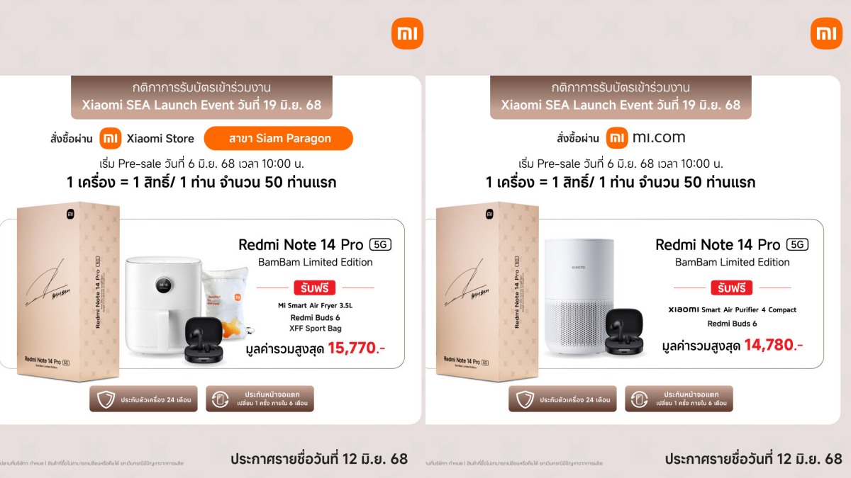 เสียวหมี่ ประเทศไทย เปิดให้จองล่วงหน้า Redmi Note 14 Pro 5G BamBam Limited Edition สมาร์ทโฟนรุ่นพิเศษที่มาพร้อมลายเซ็นเอกลักษณ์จาก แบมแบม กันต์พิมุกต์ เพียง 100 เครื่องเท่านั้น ในราคาพิเศษ 10,990 บาท ระหว่างวันที่ 6-11 มิถุนายน 2568