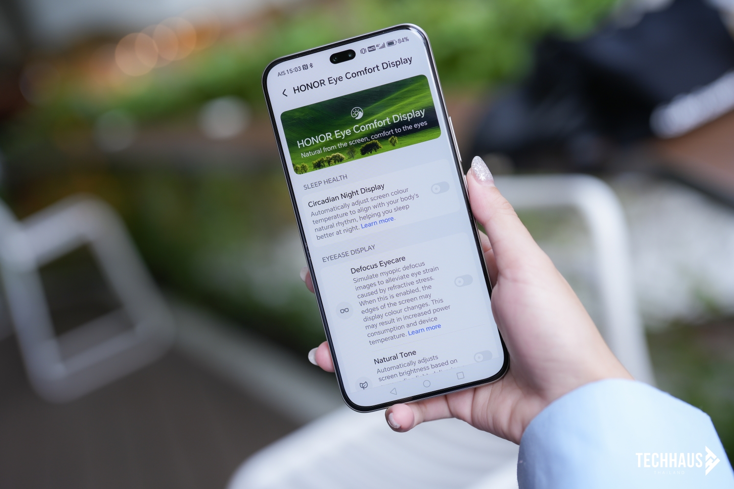ที่น่าประทับใจคือเทคโนโลยี HONOR Eye Comfort Display ที่ช่วยลดการเมื่อยล้าของสายตา ด้วยระบบ Dynamic Dimming แบบ 3840Hz ที่ลดความสว่างอย่างนุ่มนวล และ Circadian Night Mode ที่ปรับโทนสีตามเวลา ลดแสงสีน้ำเงินได้ถึง 18% ช่วยให้นอนหลับง่ายขึ้น