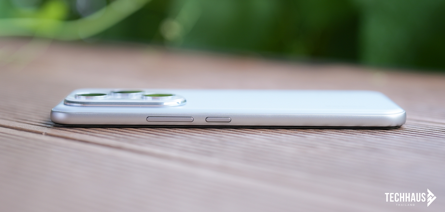 ด้านขวาคือจุดที่ใช้งานบ่อยที่สุด มีปุ่มเพิ่ม-ลดระดับเสียงที่กดตอบสนองดี ถัดลงมาเป็นปุ่ม Power สำหรับล็อคหน้าจอและเปิด-ปิด รีสตาร์ทเครื่อง ตำแหน่งจัดวางพอดีนิ้วโป้ง ใช้งานได้อย่างสะดวก