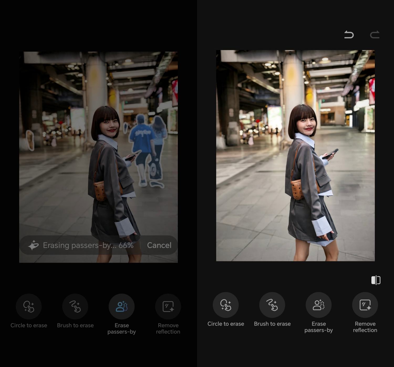 นอกจาก AI Image to Video แล้ว ยังมี AI Erase Passers-by ที่ช่วยลบคนแปลกหน้าออกจากรูปได้อย่างเนียนเนื้อ โดยระบบจะวิเคราะห์พื้นหลังและเติมส่วนที่หายไปให้สมบูรณ์ ผลลัพธ์ที่ได้ดูเหมือนไม่เคยมีคนคนนั้นอยู่ในรูปตั้งแต่แรก