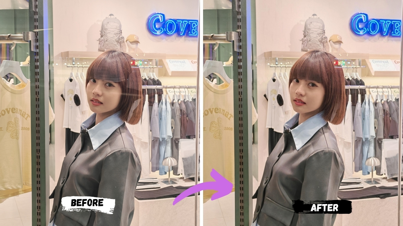 AI Remove Reflection ช่วยลบเงาสะท้อนที่ไม่ต้องการ เหมาะสำหรับการถ่ายผ่านกระจกหรือน้ำ ระบบจะตรวจจับและกำจัดการสะท้อนโดยไม่ทำลายรายละเอียดของภาพหลัก