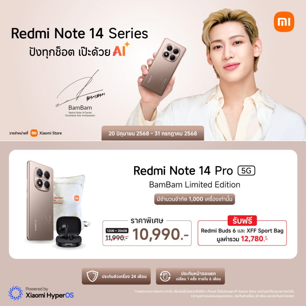 Redmi Note 14 Pro 5G BamBam Limited Edition รุ่นความจุ 12GB+256GB วางจำหน่ายในราคาพิเศษ 10,990 บาท จากราคาปกติ 11,990 บาท ที่ Xiaomi Store เท่านั้น สำหรับลูกค้าที่ซื้อในระหว่างวันที่ 20 มิถุนายน ถึง 31 กรกฎาคม 2568 จะได้รับฟรีหูฟัง Redmi Buds 6 กระเป๋า XFF Sport Bag ประกันตัวเครื่อง 24 เดือน และประกันหน้าจอแตกเปลี่ยน 1 ครั้งภายใน 6 เดือน มูลค่ารวม 12,780 บาท