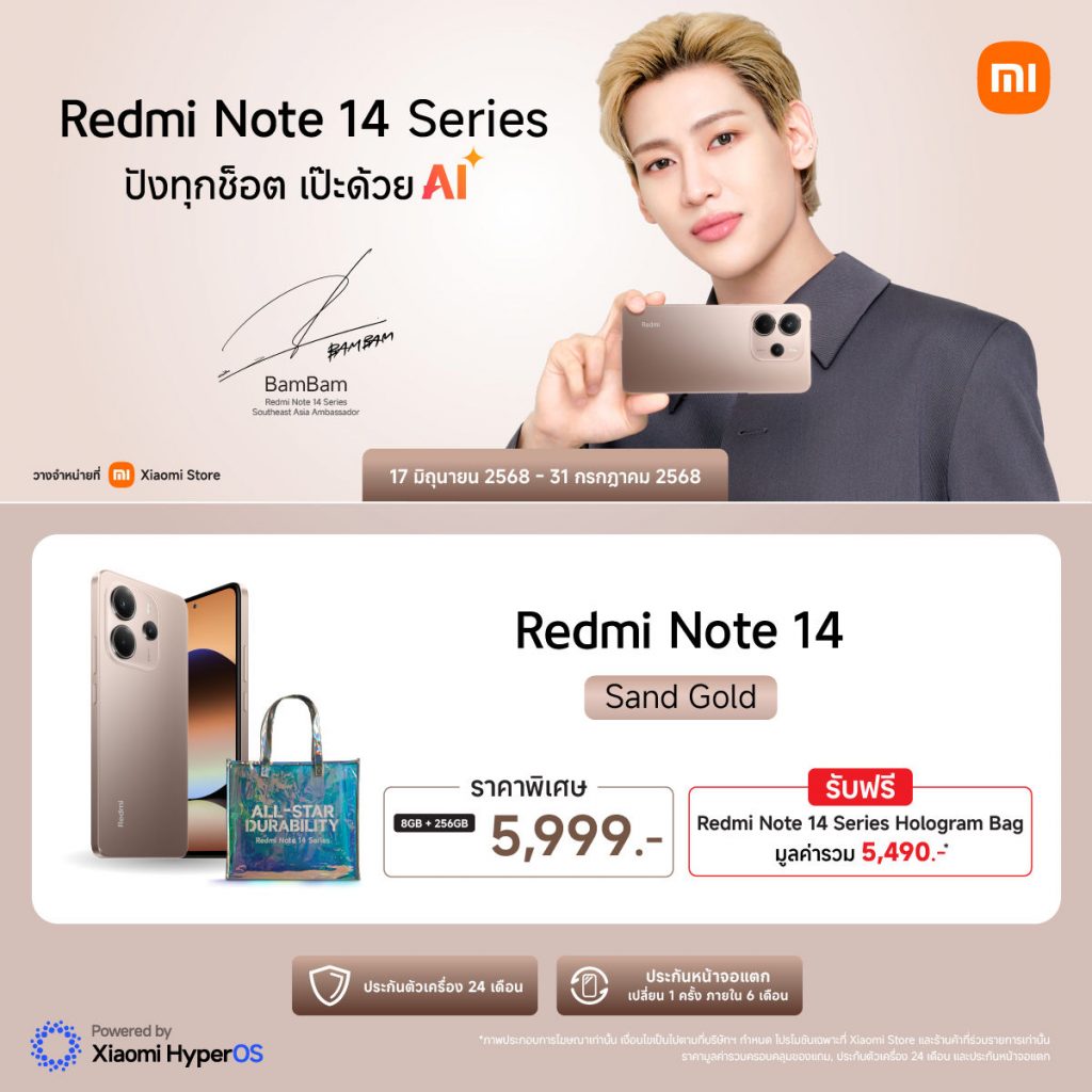 เสียวหมี่ ประเทศไทย ประกาศวางจำหน่ายสมาร์ทโฟน Redmi Note 14 Pro 5G BamBam Limited Edition และ Redmi Note 14 สีใหม่ Sand Gold อย่างเป็นทางการ พร้อมจัดโปรโมชันสุดพิเศษสำหรับ Redmi Note 14 Series ทุกรุ่น