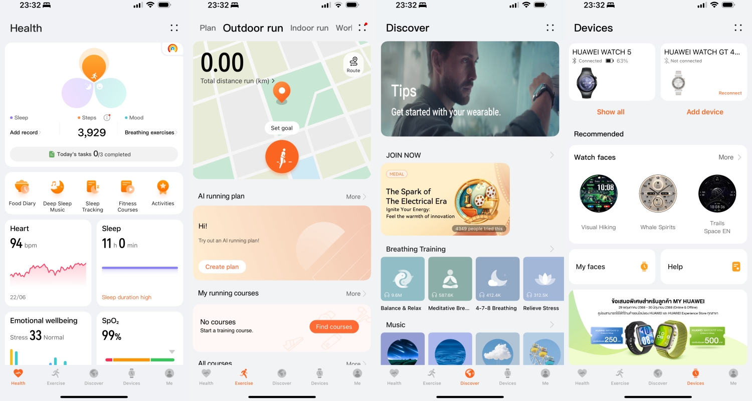 พร้อม HUAWEI Health+ ที่มีคอร์สออกกำลังกาย แผนฟิตเนส เทคนิคการหายใจ และเพลงประกอบการนอนมากมาย