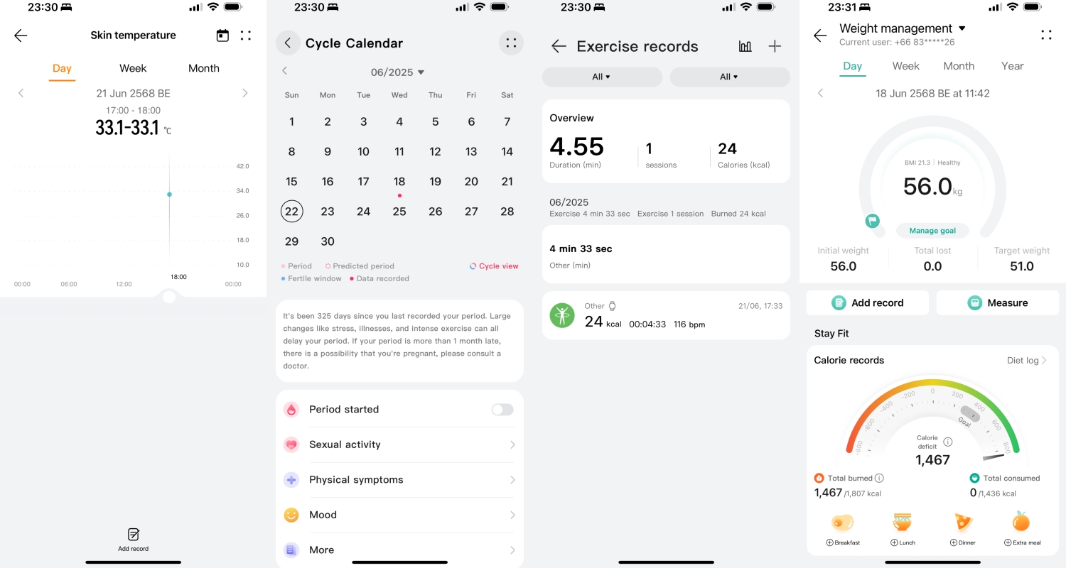 เซนเซอร์ X-TAP ที่ปุ่มด้านข้างนี้ไม่ใช่ปุ่มธรรมดา มันถูกออกแบบมาให้สัมผัสและรับรู้แรงกดที่แตกต่างกัน รวมถึงรูปแบบการสัมผัสได้อย่างชาญฉลาด แค่แตะเซนเซอร์ที่ด้านข้างนาฬิกาเป็นเวลา 3 วินาที ก็จะเข้าสู่โหมด Health Glance ที่แสดงข้อมูลสุขภาพครบครัน 8 ดัชนีสำคัญ ได้แก่ อัตราการเต้นหัวใจ HRV ระดับออกซิเจนในเลือด อุณหภูมิร่างกาย ภาวะอารมณ์ ความเครียด คลื่นไฟฟ้าหัวใจ และการรับรู้การเต้นของหัวใจ