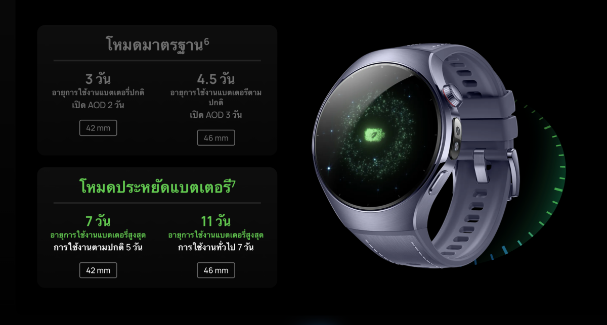 โดย HUAWEI WATCH 5 รุ่น 42mm สามารถใช้งานได้ 3 วันในโหมดมาตรฐาน หรือสูงสุด 7 วันในโหมดประหยัดแบตเตอรี่