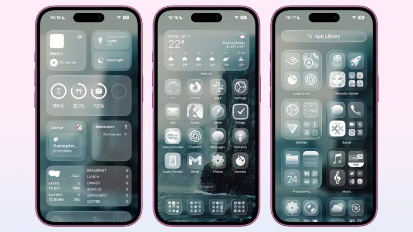 บนหน้าจอ Home Screen แถบค้นหา dock และโฟลเดอร์แอปจะมีลักษณะโปร่งใส โดยไิอคอนแอปจะมีรูปลักษณ์แบบ layered glass (กระจกหลายชั้น) ที่ให้มิติใหม่ รวมถึงตัวเลือก “Clear” สำหรับไอคอนแบบกระจกใสใหม่ การตั้งค่านี้จะทำให้ไอคอนแอปและวิดเจ็ตกลายเป็นแบบโปร่งใส