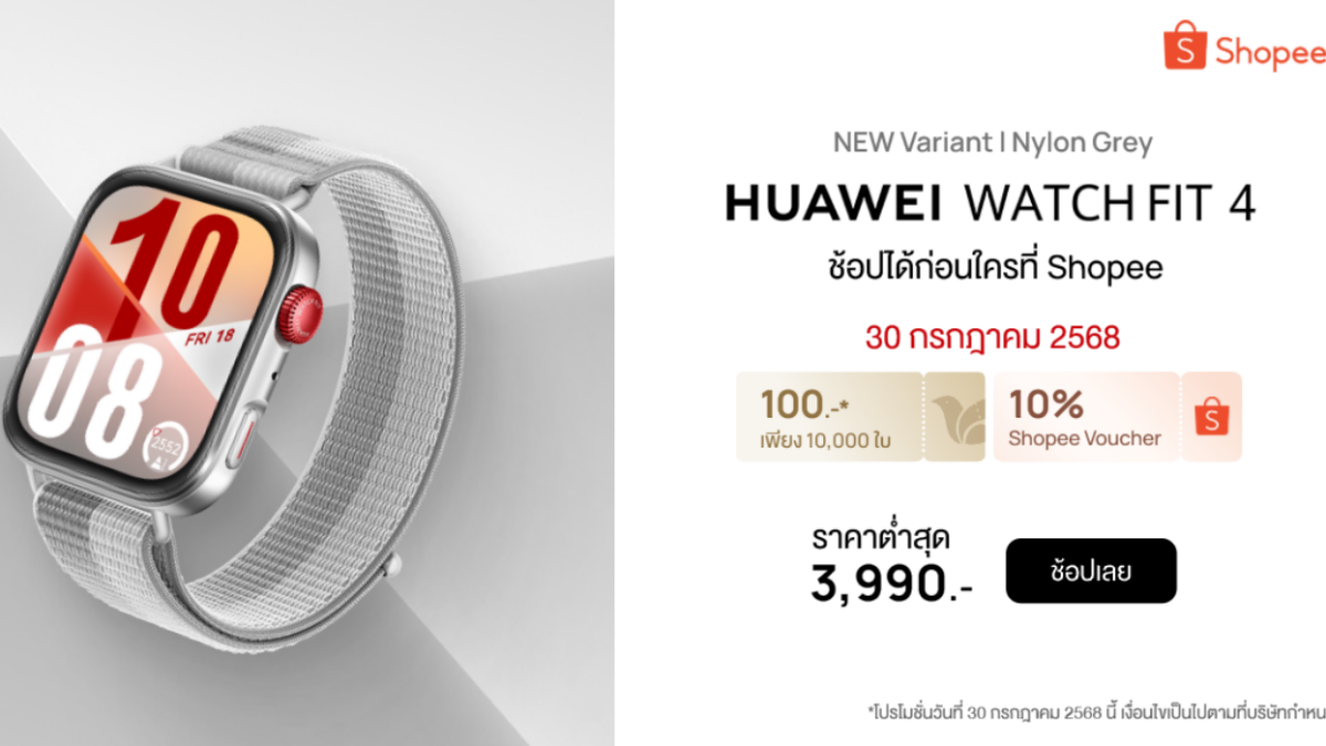 หัวเว่ย เปิดตัว HUAWEI WATCH FIT 4 สีเทาใหม่ที่มาพร้อมสายถัก 3D Nylon และฟีเจอร์สุขภาพครบครัน วางจำหน่ายเอ็กซ์คลูซีฟที่ Shopee ในราคาพิเศษ 3,990 บาท จากปกติ 4,990 บาท พร้อมสิทธิ์ใช้งาน HUAWEI Health+ ฟรี 3 เดือน