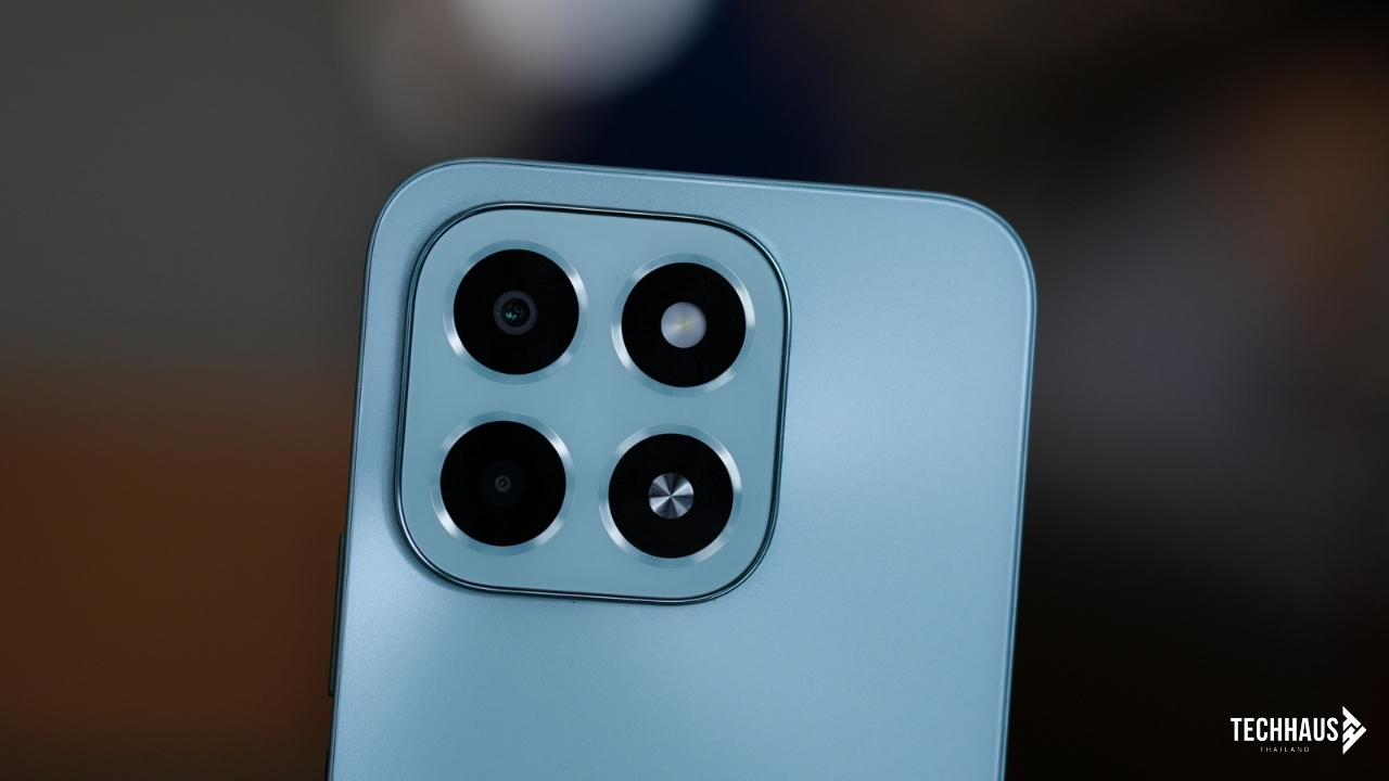 พลิกมาต่อกันที่ด้านหลังของตัวเครื่องจะพบกับโมดูลกล้องดีไซน์สี่เหลี่ยม มาพร้อมกล้องหลังตัวหลักความละเอียด 50MP (รูรับแสง F1.8) + เลนส์เสริม และไฟแฟลช LED รองรับการถ่ายวิดีโอความละเอียด 1080P