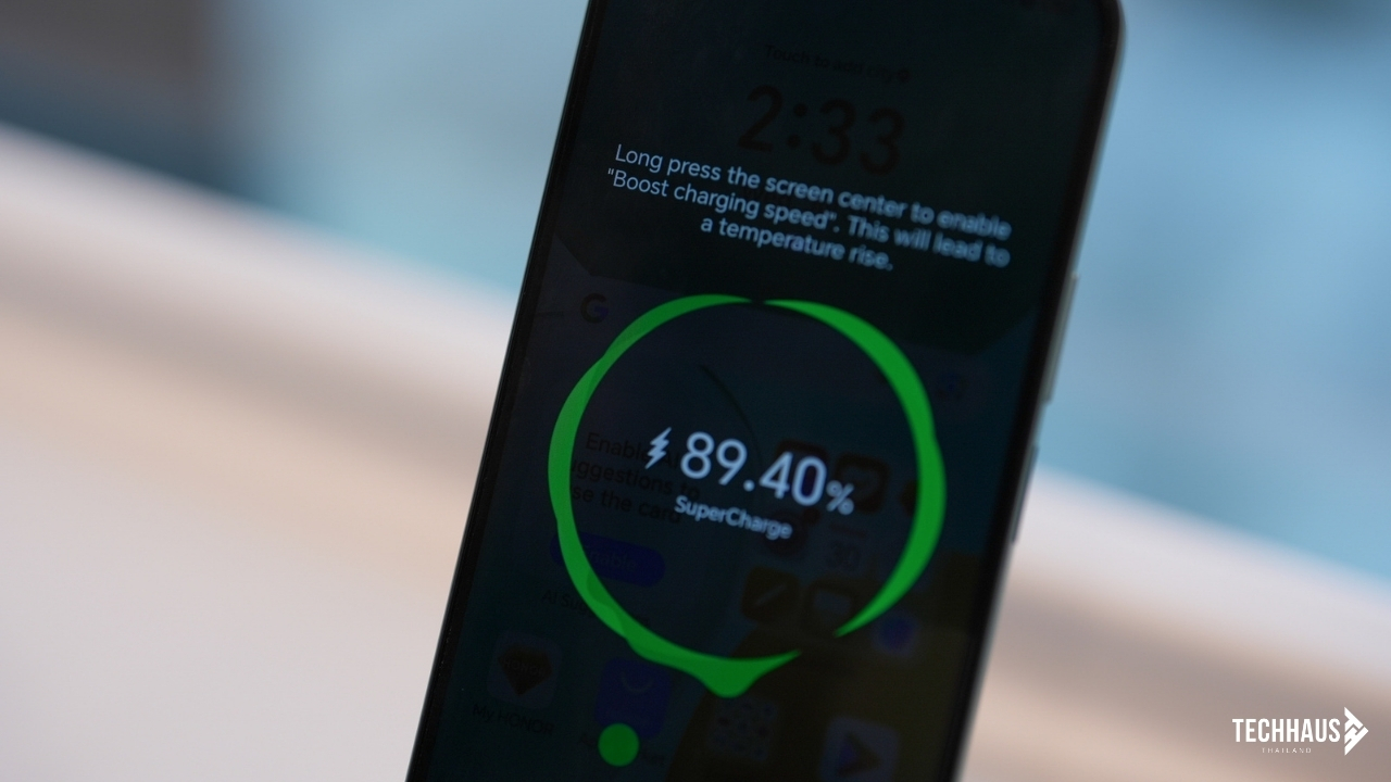 ระบบ HONOR Super-Charge 35W ที่มาพร้อมในกล่อง สามารถชาร์จได้ถึง 18% ภายในเวลาเพียง 10 นาทีเมื่อเปิดใช้งานโหมด Super-Charging Boost การชาร์จจาก 0 ถึง 100% ใช้เวลาประมาณ 1 ชั่วโมงกว่าๆ ซึ่งถือว่าเร็วมากสำหรับแบตขนาดใหญ่ขนาดนี้