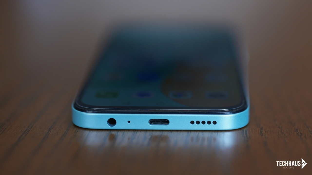 ด้านล่างของตัวเครื่องเริ่มด้วยหูฟัง 3.5 มิลลิเมตร ที่หลายแบรนด์เริ่มตัดออก แต่ HONOR ยังคงไว้ให้ ถัดมาเป็นไมโครโฟนตัดเสียงรบกวน ต่อด้วยพอร์ต USB Type-C อยู่ตรงกลาง และทางขวาเป็นลำโพงเสียง