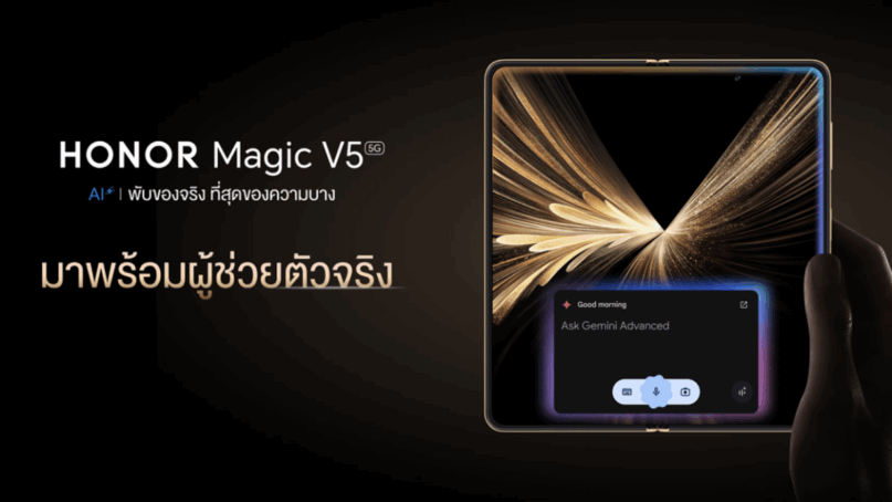 HONOR เตรียมเปิดตัว Magic V5 สมาร์ตโฟนจอพับรุ่นล่าสุดที่อ้างว่าบางที่สุดในโลก มาพร้อมการผนึกกำลัง Google Gemini และเทคโนโลยี Advance AI ที่จะเปลี่ยนวิธีการทำงานและใช้ชีวิตประจำวันของผู้ใช้ให้ฉลาดและมีประสิทธิภาพมากขึ้น