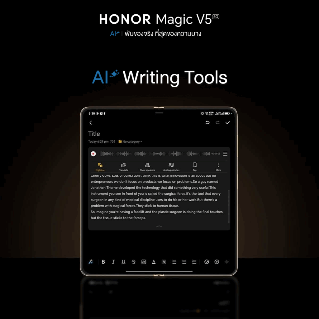 นอกจาก Google Gemini แล้ว HONOR Magic V5 ยังมาพร้อม Advance AI อัจฉริยะเฉพาะตัวที่ออกแบบมาเพื่อเข้าใจผู้ใช้ในทุกมิติ ทั้งภาษา วัฒนธรรม และไลฟ์สไตล์ได้อย่างลึกซึ้ง