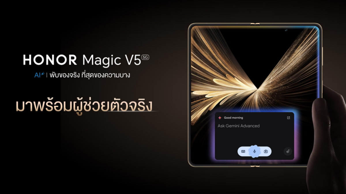 HONOR เตรียมเปิดตัว Magic V5 สมาร์ตโฟนจอพับรุ่นล่าสุดที่อ้างว่าบางที่สุดในโลก มาพร้อมการผนึกกำลัง Google Gemini และเทคโนโลยี Advance AI ที่จะเปลี่ยนวิธีการทำงานและใช้ชีวิตประจำวันของผู้ใช้ให้ฉลาดและมีประสิทธิภาพมากขึ้น