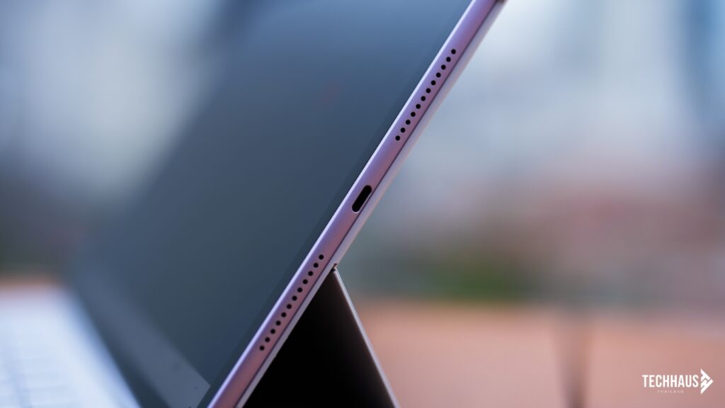 เมื่อมองไปรอบตัวเครื่อง เราจะพบพอร์ตชาร์จ USB-C ที่ทันสมัย และลำโพงสเตอริโอ 4 ตัว พร้อมเทคโนโลยี Histen 9.0 ที่ให้เสียงเต็มอิ่มและมีมิติมากกว่าสมาร์ทโฟนทั่วไปอย่างเห็นได้ชัด
