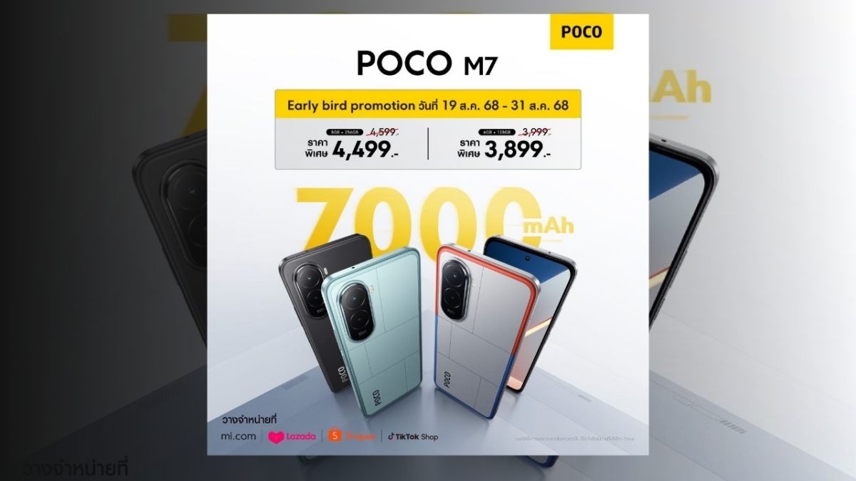POCO M7 เปิดตัวพร้อมแบตเตอรี่ยักษ์ 7000mAh ราคาเริ่มต้น 3,899 บาท