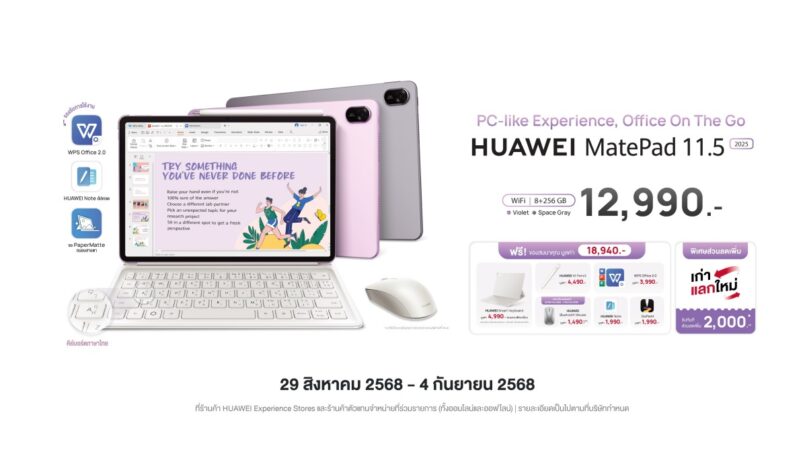หัวเว่ย คอนซูมเมอร์ บิสสิเนส กรุ๊ป (ประเทศไทย) เปิดตัวแท็บเล็ตรุ่นใหม่ HUAWEI MatePad 11.5″ 2025 ในราคาสุดคุ้มเพียง 12,990 บาท มาพร้อมประสบการณ์การใช้งานระดับคอมพิวเตอร์และเทคโนโลยีจอภาพ PaperMatte ที่ช่วยปกป้องสายตา เปิดให้จองล่วงหน้าวันที่ 29 สิงหาคม – 4 กันยายน 2568