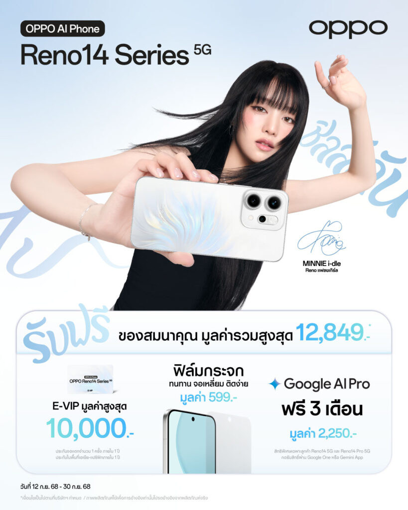 ออปโป้ จัดโปรโมชันพิเศษสำหรับสมาร์ตโฟน OPPO Reno14 Series 5G ตั้งแต่วันที่ 12-30 กันยายน 2568 พร้อมของสมนาคุณฟรีมูลค่าสูงสุดถึง 12,849 บาท
