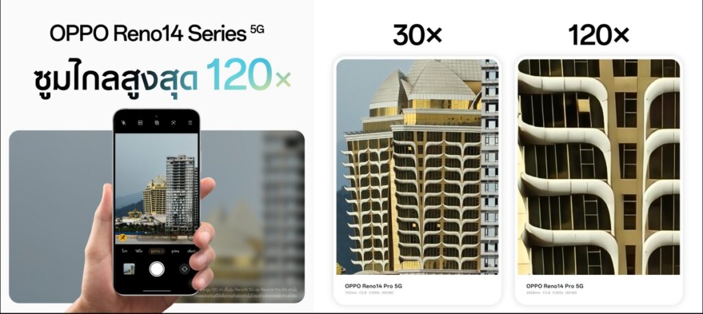สำหรับ OPPO Reno14 5G และ OPPO Reno14 Pro 5G มีความสามารถพิเศษในการซูมได้ไกลถึง 120 เท่า พร้อมโหมดเวที (Stage Mode) ทั้งในการถ่ายภาพและวิดีโอ ทำให้สามารถเก็บรายละเอียดได้อย่างคมชัดแม้ในระยะไกล