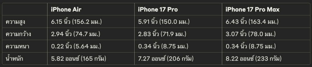 iPhone Air มาพร้อมหน้าจอ 6.5 นิ้ว กรอบไทเทเนียมขัดเงาพร้อมด้านหลังกระจก ระบบระบายความร้อนแบบ Vapor Chamber และ GPU 5 แกน ส่วน iPhone 17 Pro และ iPhone 17 Pro Max มีหน้าจอ 6.3 นิ้วและ 6.9 นิ้วตามลำดับ โครงสร้างอลูมิเนียม Unibody แบบ Anodized และ GPU 6 แกน