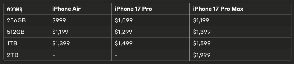 iPhone Air มีความจุ 256GB, 512GB หรือ 1TB ส่วน iPhone 17 Pro มีความจุ 256GB, 512GB หรือ 1TB และ iPhone 17 Pro Max มีตัวเลือก 256GB, 512GB, 1TB หรือ 2TB