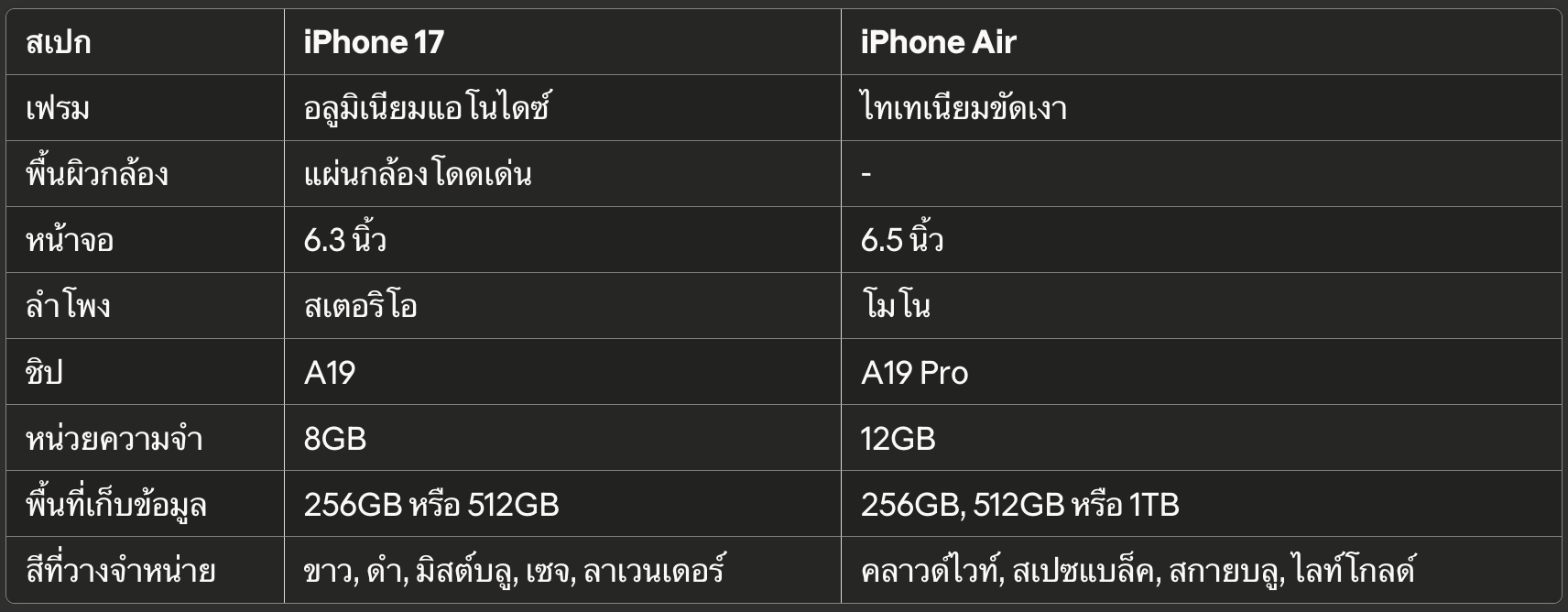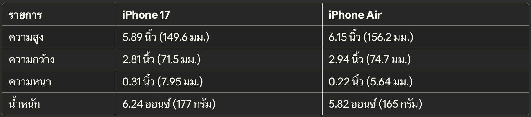 iPhone 17 และ iPhone Air มีความแตกต่างด้านขนาดอย่างชัดเจน โดย iPhone Air มีความสูงและความกว้างมากกว่า แต่บางกว่าและเบากว่าอย่างเห็นได้ชัด