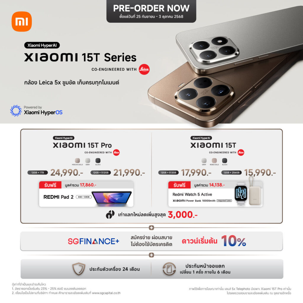 เสียวหมี่ ประเทศไทย ยังร่วมกับ เอสจี แคปปิตอล ให้ลูกค้าเป็นเจ้าของสมาร์ทโฟน Xiaomi 15T Series ด้วยโปรแกรม SG Finance+ ไม่ต้องใช้บัตรเครดิต โดยดาวน์เริ่มต้น 10%