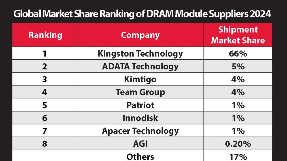 Kingston ยังคงรักษาความเป็นผู้นำในตลาดโมดูล DRAM ได้อย่างแข็งแกร่ง แม้จะเผชิญกับความท้าทายจากอุปสงค์ผู้บริโภคที่ชзамедลนตัวในช่วงครึ่งหลังของปี ตามการจัดอันดับรายได้ล่าสุดโดย TrendForce บริษัทสามารถรักษาส่วนแบ่งตลาดไว้ได้ถึง 66% ทิ้งห่างคู่แข่งอันดับสองที่มีส่วนแบ่งเพียง 5% อย่างชัดเจน
