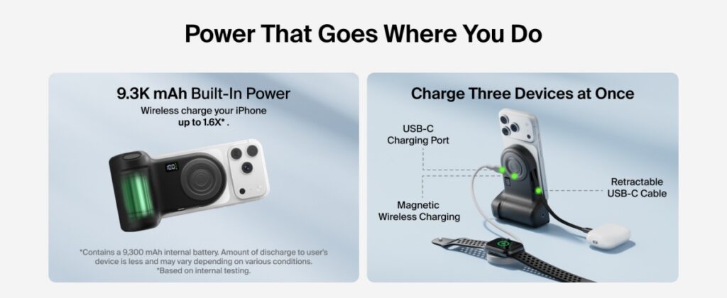 PowerGrip รองรับการชาร์จแบบไร้สายด้วยกำลังไฟ 15W และสามารถชาร์จอุปกรณ์ได้พร้อมกันถึง 3 เครื่อง นอกจากนี้ยังมีสายชาร์จ USB-C แบบหดเก็บได้ยาว 0.75 เมตรหรือ 29.5 นิ้ว พร้อมพอร์ต USB-C เพิ่มเติมสำหรับรับและส่งกระแสไฟ ทำให้ตอบโจทย์การใช้งานที่หลากหลาย