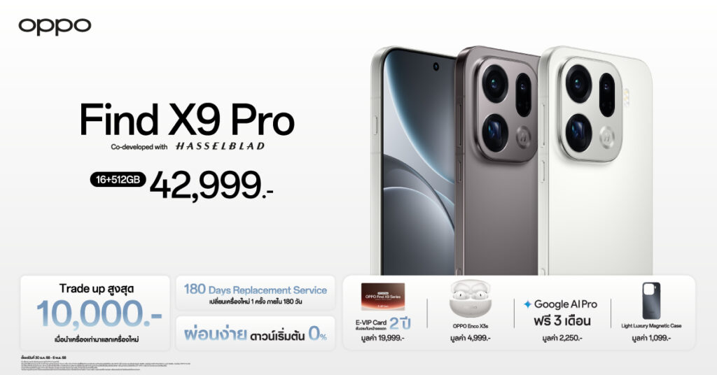 ทั้งนี้ OPPO สานต่อความร่วมมือกับ Hasselblad แบรนด์กล้องระดับตำนานจากสวีเดน ยกระดับการถ่ายภาพพอร์ตเทรตให้มีสีผิวที่เป็นธรรมชาติ มีมิติ แสง และโทนสีที่สมจริงในทุกช็อตผ่านโหมด Hasselblad Portrait ทำงานอย่างลื่นไหลด้วยระบบปฏิบัติการ ColorOS 16 ใหม่ล่าสุด บนดีไซน์ใหม่ที่สะท้อนความพรีเมียมทุกองศา ด้วยขอบหน้าจอบางเฉียบ จับถนัดมือ เปิดตัวพร้อมกัน 2 รุ่น ได้แก่ OPPO Find X9 Pro ในราคา 42,999 บาท และ OPPO Find X9 ในราคาเริ่มต้น 29,999 บาท พร้อมหูฟังไร้สายระดับแฟลกชิป OPPO Enco X3s ในราคา 4,999 บาท สัมผัสได้แล้ววันนี้ ณ OPPO Brand Shop ทุกสาขา และตัวแทนจำหน่ายทั่วประเทศ