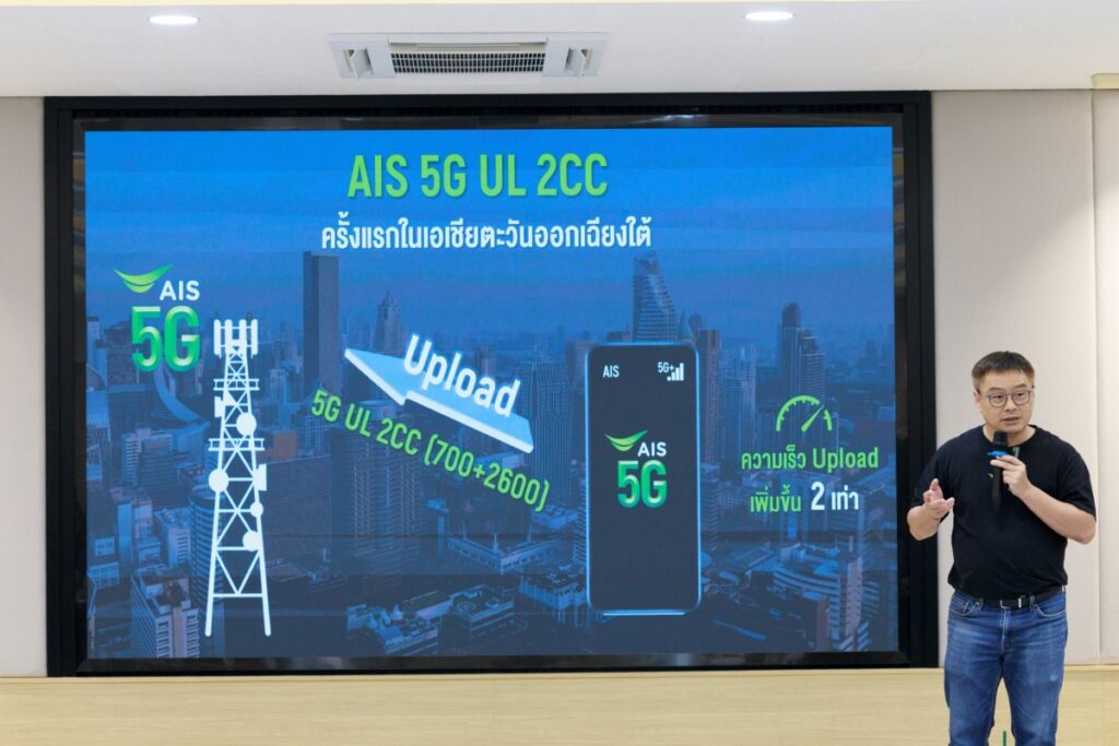 AIS ตอบโจทย์ความต้องการนี้ด้วยเทคโนโลยี 5G UL 2CC (Uplink Carrier Aggregation) ที่ผสมผสานคลื่นความถี่ 700MHz กับ 2600MHz เข้าด้วยกัน ส่งผลให้ความเร็วในการอัปโหลดเพิ่มขึ้นถึง 2 เท่า นับเป็นครั้งแรกในเอเชียตะวันออกเฉียงใต้ที่มีการนำเทคโนโลยีนี้มาใช้งานเชิงพาณิชย์