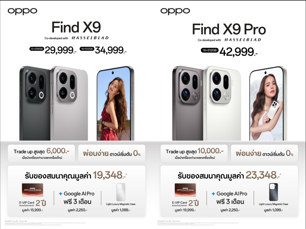 OPPO Find X9 มาพร้อมดีไซน์สุดโดดเด่นใน 2 สี คือ Silk White และ Titanium Charcoal โดยมี 2 รุ่นให้เลือก ได้แก่ รุ่น 12+256GB ราคา 29,999 บาท และรุ่น 16+512GB ราคา 34,999 บาท ขณะที่ OPPO Find X9 Pro (16+512GB) มาในสีคลาสสิกอย่าง Titanium Grey และ Space Black วางจำหน่ายในราคา 42,999 บาท