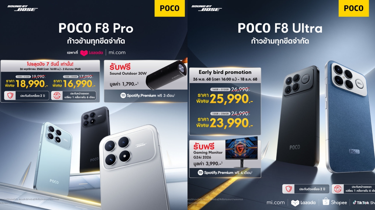 สำหรับลูกค้าที่ซื้อผ่านช่องทาง Shopee หรือ Lazada ในช่วง 26-30 พฤศจิกายน 2568 จะได้รับส่วนลดและของแถมมูลค่าสูงสุดถึง 4,000 บาท พร้อมโอกาสลุ้นรับรางวัลใหญ่ในแคมเปญ Mega Treasure Hunt ที่มีมูลค่ารวมกว่า 6 ล้านบาท รวมถึงโอกาสลุ้นรับ POCO F8 Series ฟรี หูฟัง Xiaomi Buds 6 Play และ Voucher สูงสุด 30,000 บาท