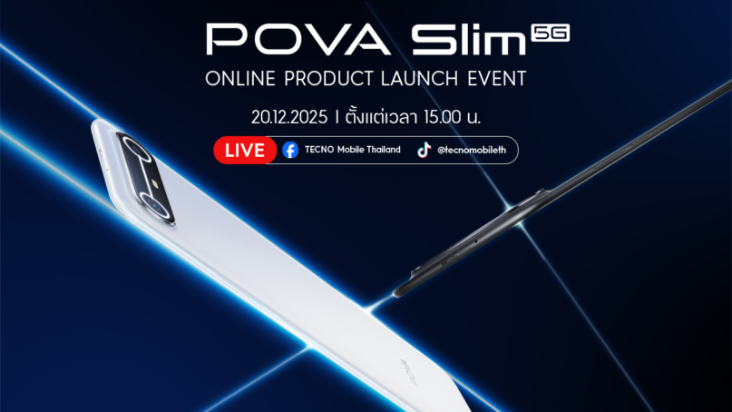แฟน ๆ TECNO สามารถร่วมเป็นส่วนหนึ่งของงานเปิดตัวออนไลน์ได้ผ่านช่องทาง Facebook และ TikTok: TECNO Mobile TH ในวันที่ 20 ธันวาคม 2568 เวลา 15.00 น. เป็นต้นไป ภายในไลฟ์จะได้พบกับแขกรับเชิญพิเศษที่จะมาร่วมเจาะลึกดีไซน์อันโดดเด่นของ POVA SLIM แบบทุกมิติ พร้อมเติมความสนุกและสีสันตลอดการไลฟ์ และยังมีไฮไลท์สุดพิเศษกับกิจกรรมลุ้นรับ TECNO POVA SLIM จำนวน 1 เครื่อง และของรางวัลอีกมากมายสำหรับผู้โชคดีภายในไลฟ์เท่านั้น