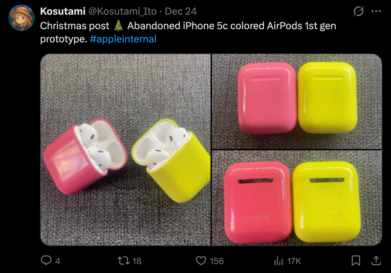 ในปี 2023 Kosutami เคยแชร์รูปภาพ AirPods สีชมพู มีรายงานว่า Apple พัฒนาตัวเลือกสีถึง 5 สีสำหรับ AirPods เพื่อให้เข้ากับ iPhone 7 โดยประมาณ แต่ตัดสินใจไม่ดำเนินการต่อ
